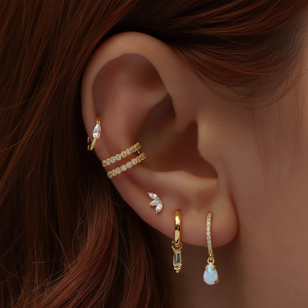 Introducing Quinn, a sophisticated trio of flat-back stud earrings that seamlessly blend botanical inspiration with refined craftsmanship. Each petal-shaped design delivers understated elegance suitable for any setting, from everyday wear to special occasions. Constructed from gold-plated S925 sterling silver with AAAAA diamond simulants, Quinn combines durability with sustainable luxury. The hypoallergenic composition and skin-friendly materials make these earrings an excellent choice for sensitive ears, while their water, sweat, and heat-resistant properties ensure lasting brilliance without discoloration or tarnishing. Engineered for all-day comfort.
