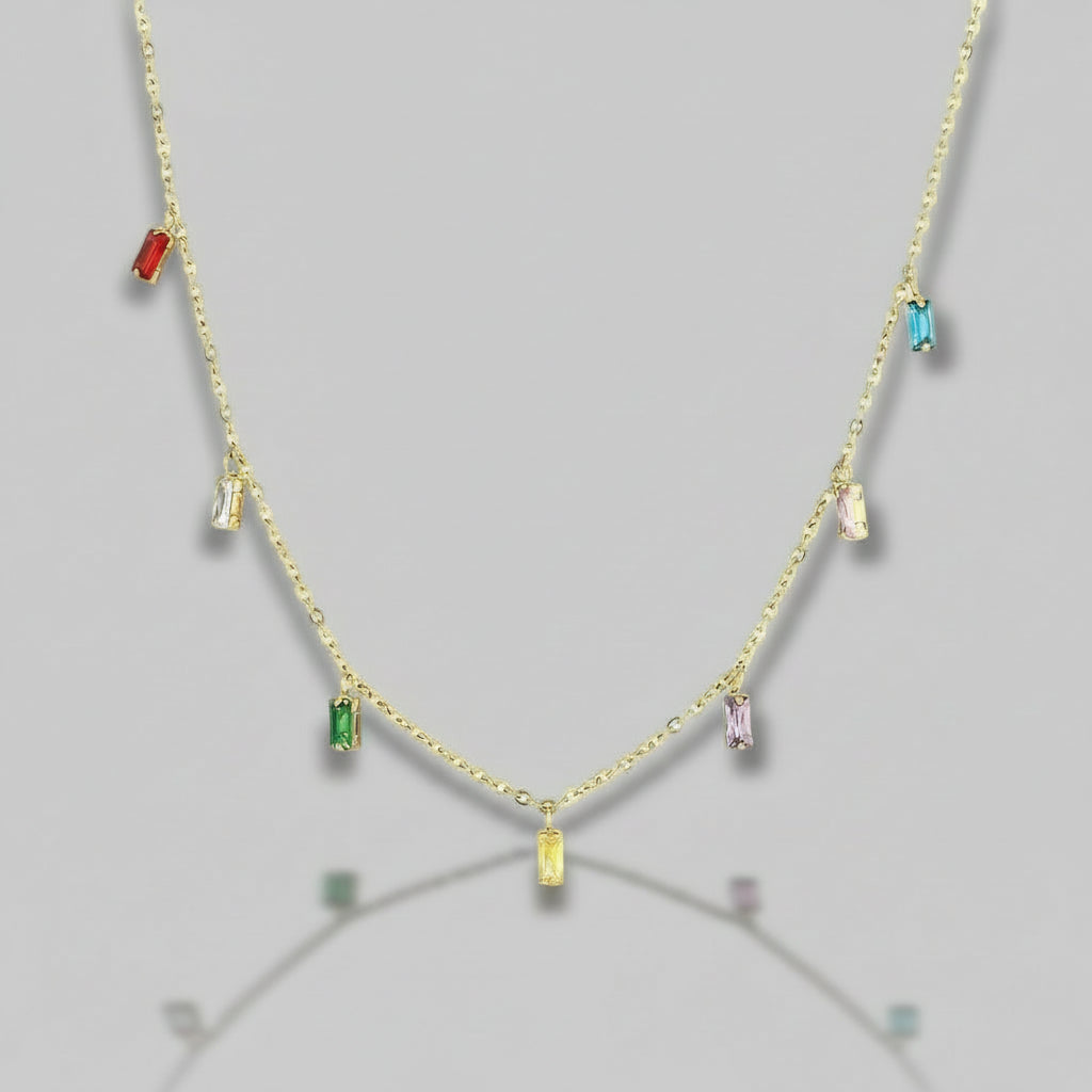 The Rhiannon Gemstone Necklace combines elegance with practicality. Featuring ethically sourced gemstones suspended from an 18k gold-plated stainless steel chain, this piece resists water, sweat, and heat without tarnishing. Hypoallergenic construction suits sensitive skin. A refined accessory for everyday wear or special occasions.