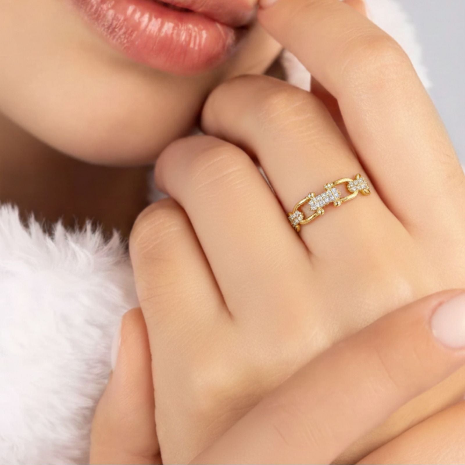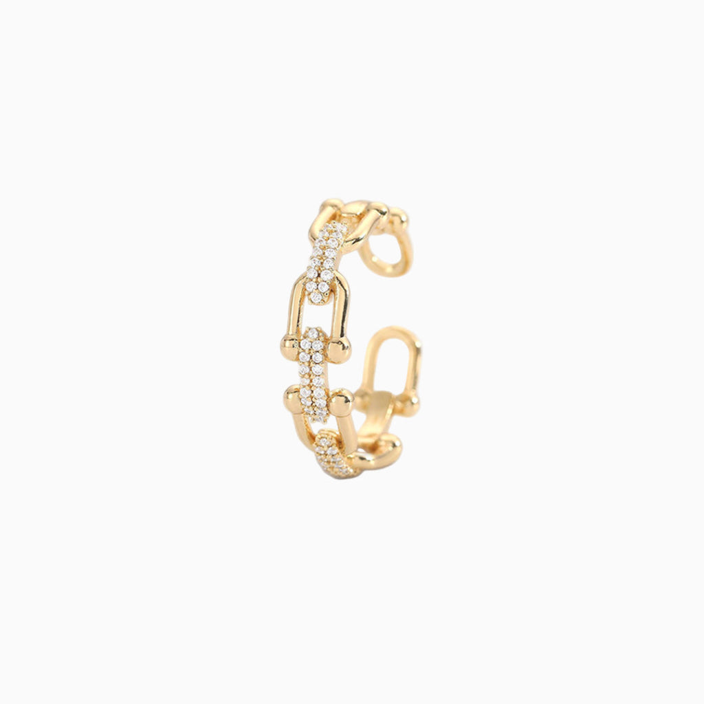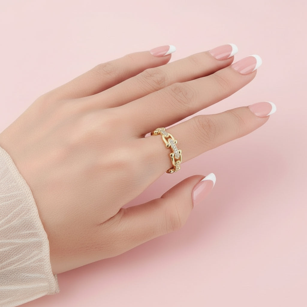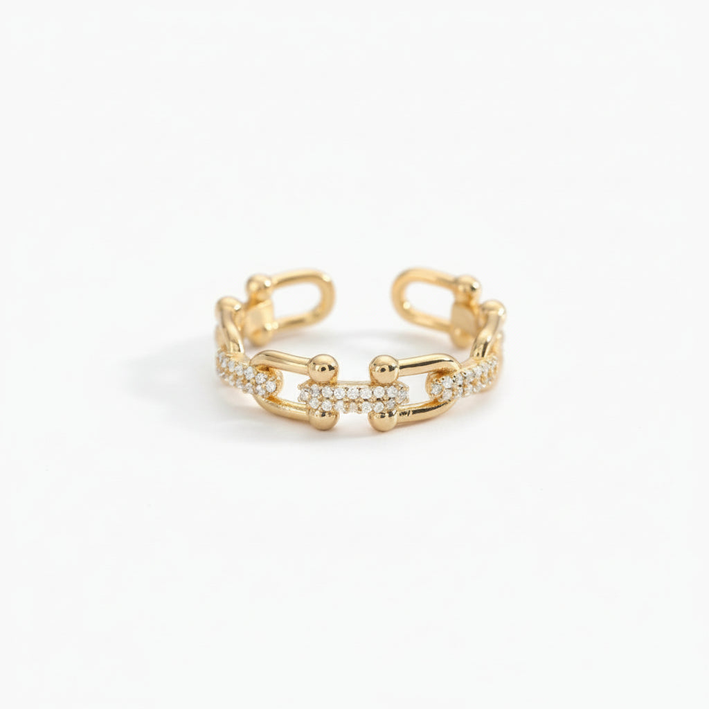 The Adjustable Crystal Gold Ring features a refined open-ended design accented with subtle crystal details for a clean, modern look. Crafted from stainless steel with 18K gold plating, it is designed to balance visual elegance with everyday durability and comfort.