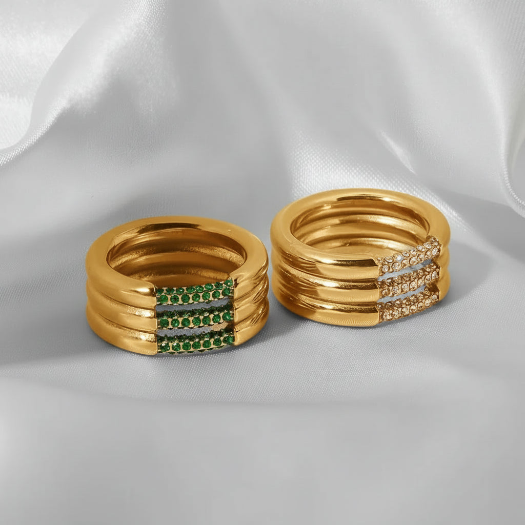 The Morgan - Gold Ring combines stainless steel with 18k gold plating and AAAAA diamond simulants for a brilliant, luxurious look. Built to resist water, sweat, and heat, it maintains its sparkle through daily wear without tarnishing. Hypoallergenic materials suit all skin types. Standing 10 mm tall and weighing 11 g, it's available in sizes 52–56 mm.