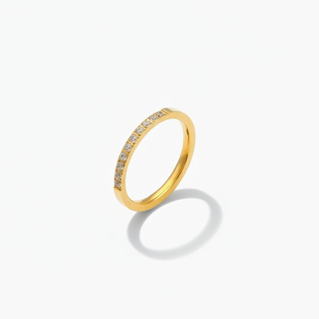 The Slim Gold Band Ring features a refined, minimal silhouette accented with subtle stone details for a clean and elegant look. Crafted from stainless steel with 18K gold plating, it is designed for everyday wear while remaining lightweight, comfortable, and durable.